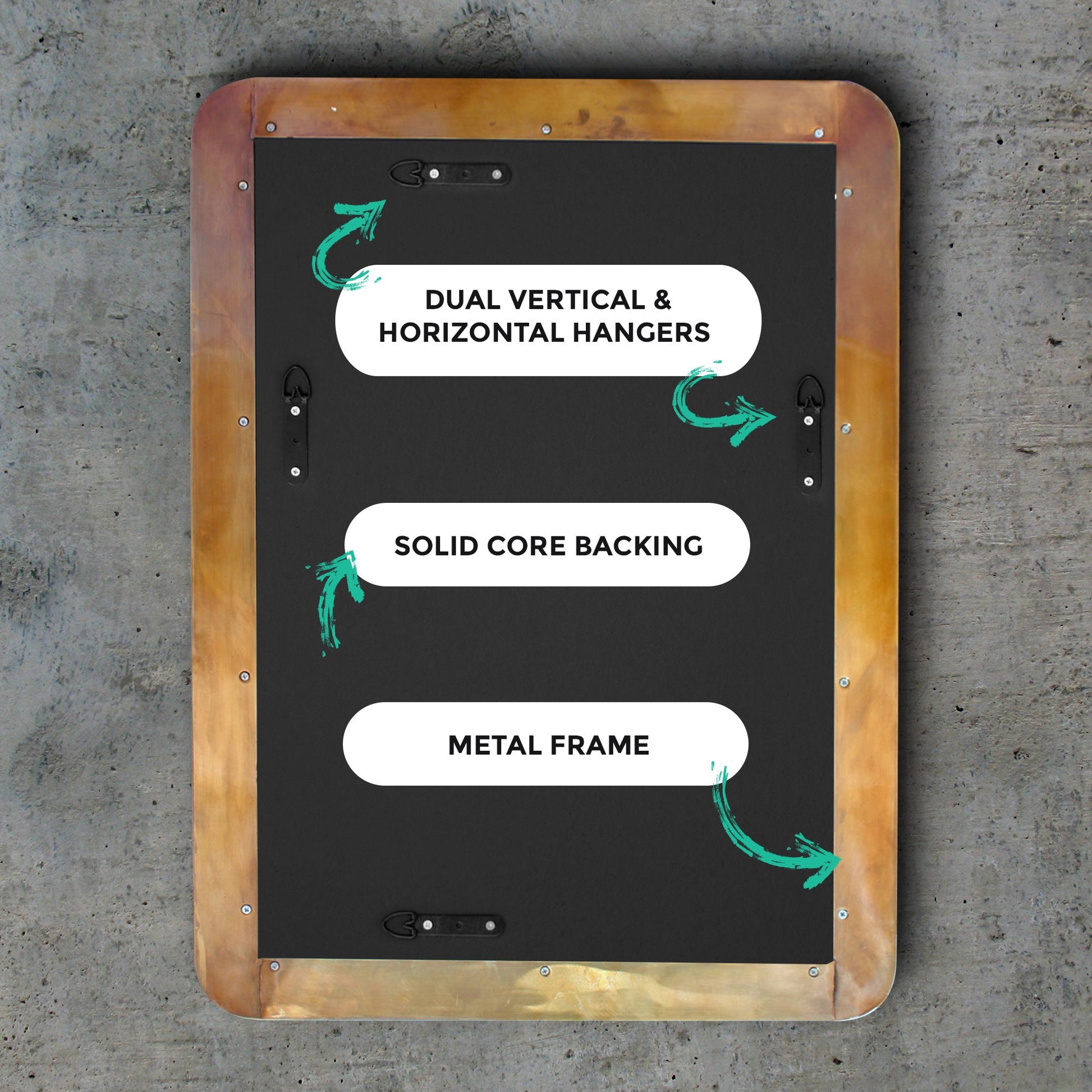 Introducing our Gold Trimmed Rectangular Mirror, a timeless and sophisticated addition to your home decor. Measuring 22 inches in height and 30 inches in width, this mirror is perfectly sized for your bathroom, bedroom, or entryway. Handcrafted and hand-curated, its artistic design is both functional and stunning. The elegant hand-brushed brass frame features round corners and an infinity design above the mirror, adding a touch of luxury to any space. With a polished surface that eliminates visual distortion and a premium MDF back that prevents humidity corrosion, this mirror is ideal for bathroom use. Enhance the beauty of your home with this striking mirror, perfect for making a statement or complementing other decor pieces.